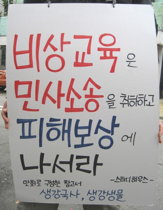 그러나 정씨는 "만화작가와 교재저자 등 11명이 1년에 걸친 공동작업으로 개발했지만 비상교육의 배포중단으로 인한 금전적인 손해를 본 것은 인정하지 않고 있다며 책을 팔려고도 않하다가 안 팔린 선인세를 요구하는 것은 납득하기 어렵다"며 "독립해 직접 출판하니까 고의적으로 책을 시중 서점에 깔아 영업방해는 물론 대기업이 1인 출판사를 죽이려하는 것"이라고 "대기업의 횡포가 극심하다"고 주장했다.